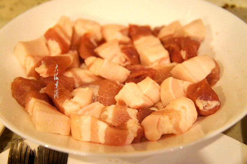 买回来的新鲜五花肉,先用温水洗一洗,把肉放冷冻室冻上半小时左右,好切又杀菌,然后取出来按照自己喜欢的大小切块。