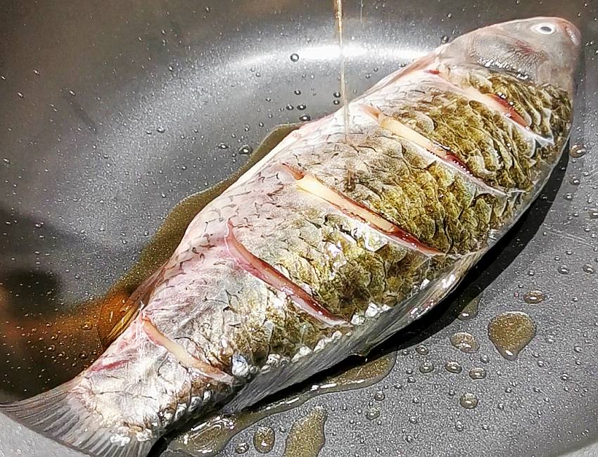 市场上买到的活鱼自己不会处理的话,最好直接让商家给处理好,回来后还要仔细检查,重新清理一下鱼鳃和肚腹,如果有洗菜机最好,用洗菜机清洗,有杀菌、去除农药残留、降解抗生素等作用。没有洗菜机直接用清水里外反复清洗干净。然后两面切花刀放上姜片腌制10分钟左右,时间长点没关系。