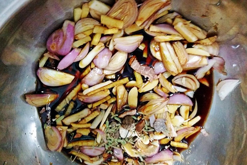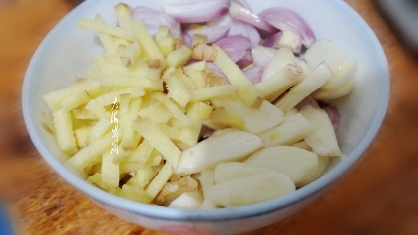 准备调味料,葱、姜、蒜去皮洗净切丝,我用的是毛葱,比大葱更提味,没有可以用大葱。