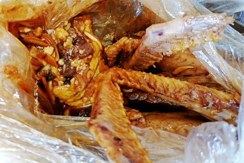 然后将调料倒入食品袋,装入大鹅冷藏,每隔两个小时拿出来翻身按摩一次,将卸掉的鹅翅膀也同时腌制上。