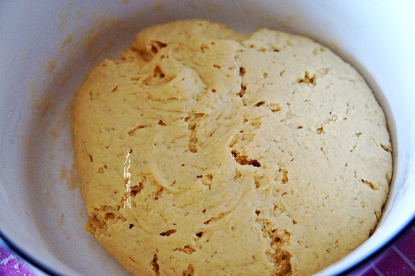 面粉中加适量的糖,南瓜羹温热时加入2~3g的酵母搅拌至融化,然后用来和面,揉成面团,盖上保鲜膜放入温暖处发酵,我是直接放入压力锅中发酵。出去办事回来看看,感觉有点过了,还是不如面包机发酵的好。