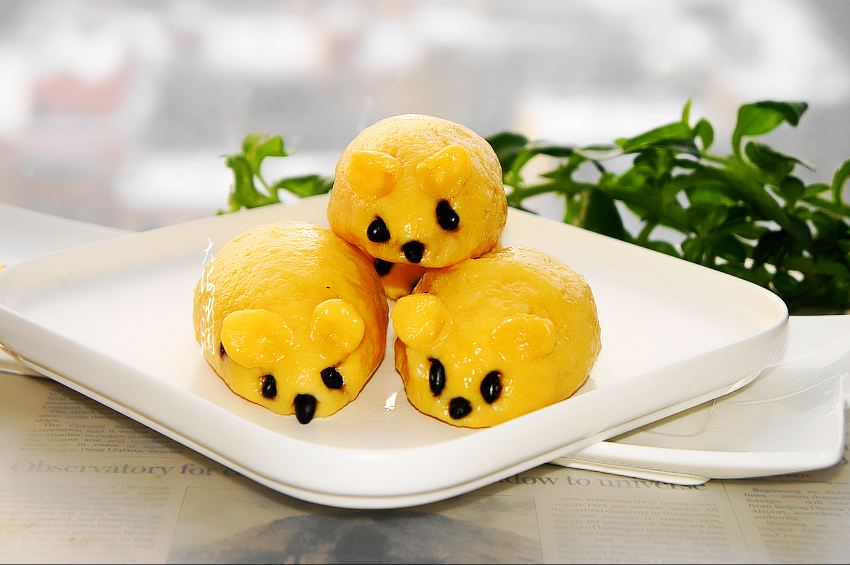 【金鼠馒头】所需食材:面粉150g;南瓜羹适量;白糖适量;酵母2g;黑豆12粒。
