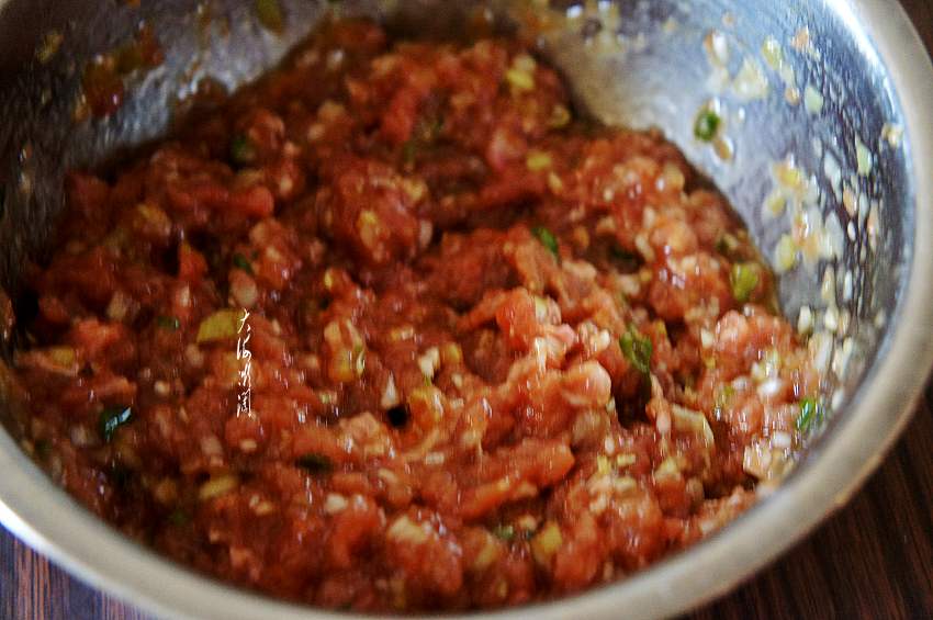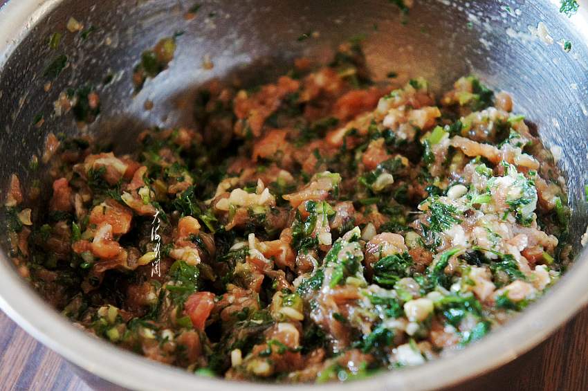 开始准备馅料。瘦猪肉洗净切碎剁成肉馅,大葱去皮洗净切碎,可以多放点大葱提味。肉馅中分多次加入老汤沿一个方向搅拌均匀上劲(没有可加少许水),让肉馅充分吸收老汤的汁液,再加入盐、油、葱、五香粉、生抽、蘑菇粉、少许料酒、蚝油拌匀。