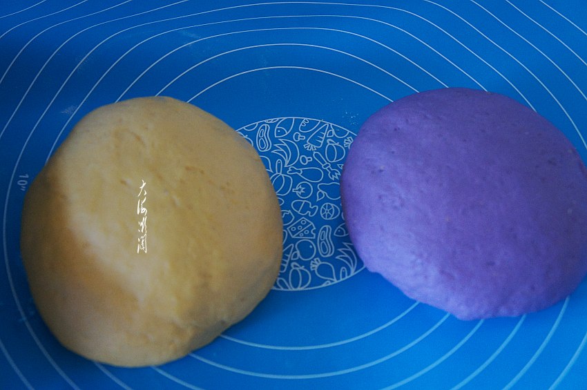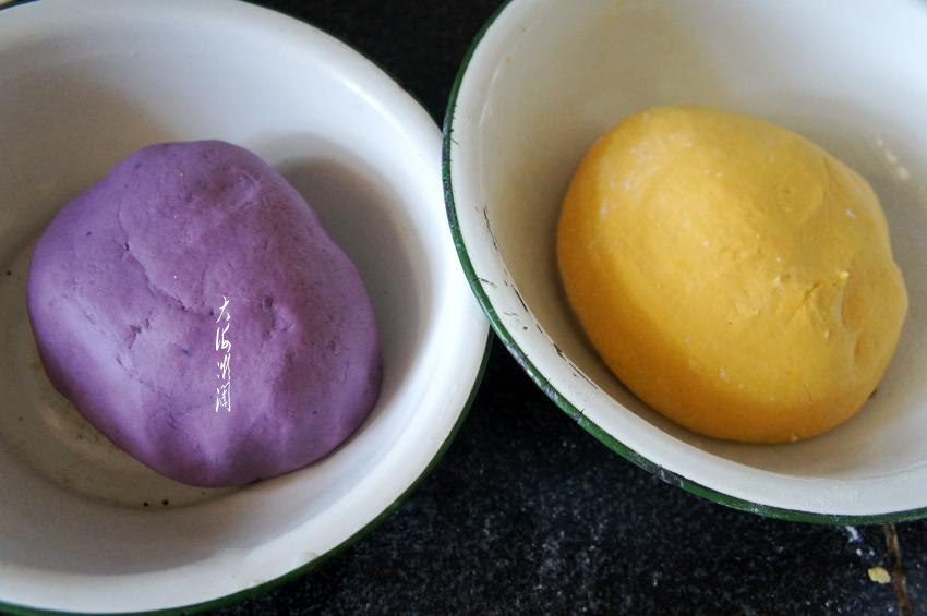 250g南瓜泥加250面粉加3g酵母,用面包机和成面团。150g面粉加150g紫薯泥加适量的水,加2g酵母入面包机和成面团。