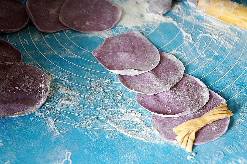 取一块紫色的面团揪小剂子,擀成饼,一点黄色的面做花心,卷起来成玫瑰花状,切开即是两朵花