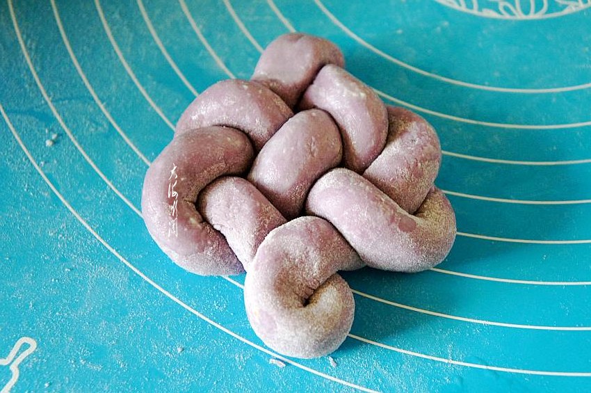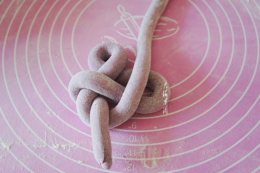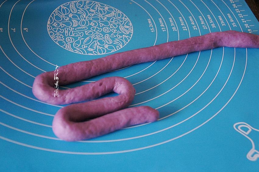 根据自己想做的成品大小取紫色面团,揉成长条,滚匀,折三折