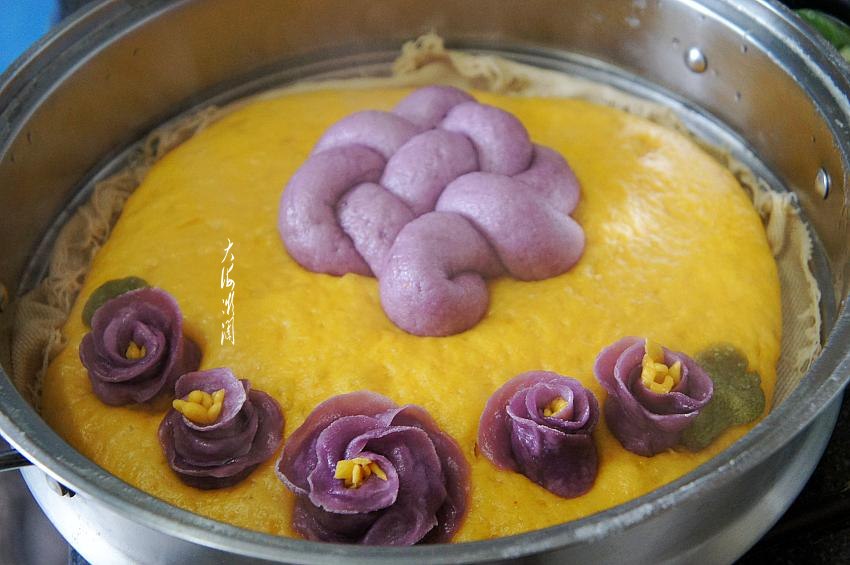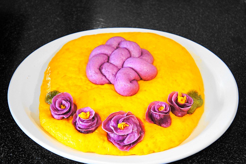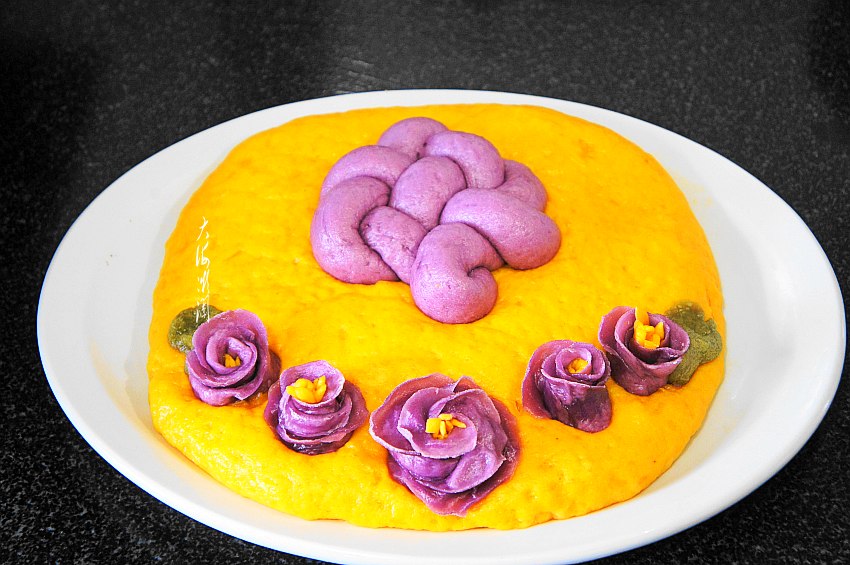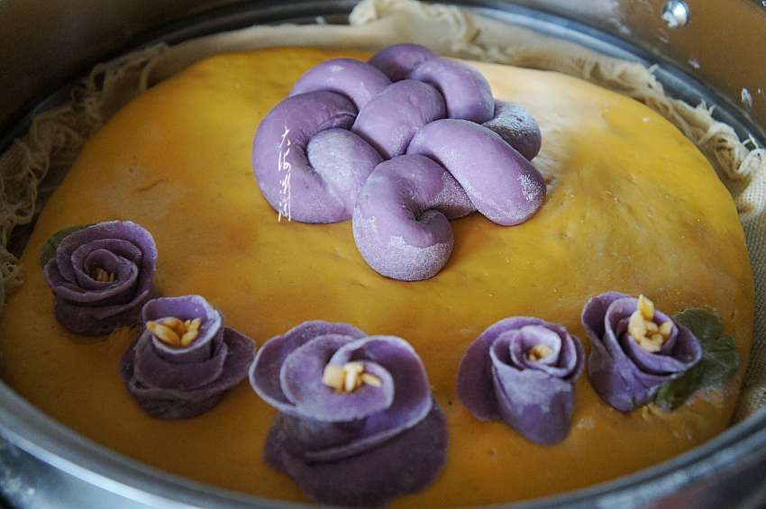 第一眼看去这富贵馒头很像中国结,由一根面条结成,上下一致,左右对称,一气呵成,首尾相连,图案非常漂亮!有意境,耐人寻味,足见中国美食源远流长!选择南瓜和紫薯泥和面,配色搭配也很靓丽,又加了一点小创意,做一幅画,编织几朵小花,寓意富贵花开,过年蒸就是百花齐放,这才是年的味道,只有我们中国人才能体会的滋味。