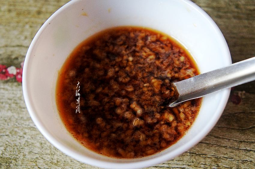 大蒜去皮洗净切碎或者用夹蒜器夹碎,加入盐、糖、果醋、味极鲜酱油、少许香油、少许辣椒油调成料汁。今天换种做法,没用老陈醋,也没炸锅,做法更简单,直接做个调料汁一拌就OK了。