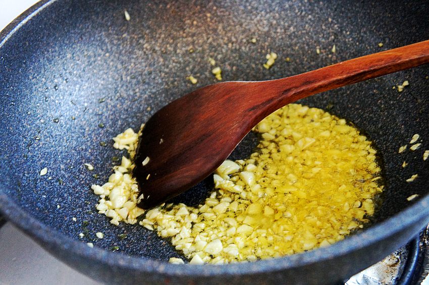 炒锅加入适量的油,下入备好的大部分蒜碎,炒至蒜香浓郁,留少许蒜碎出锅时加入。