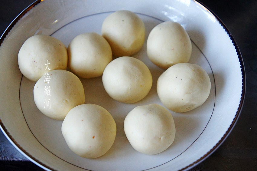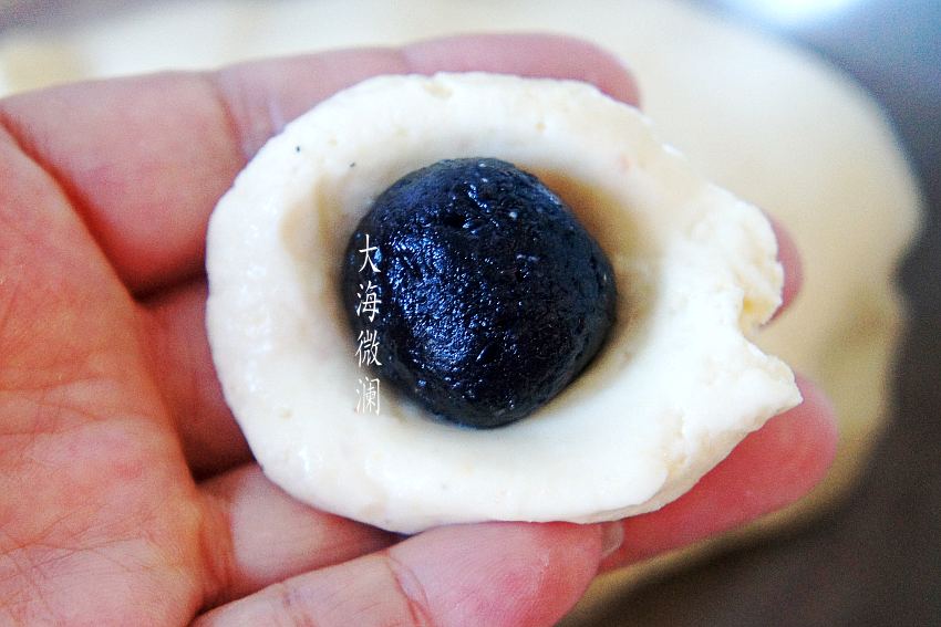 取一小块面团,包上准备好的黑芝麻丸,包好团圆,元宵不要太大。