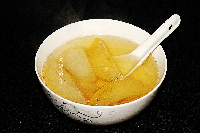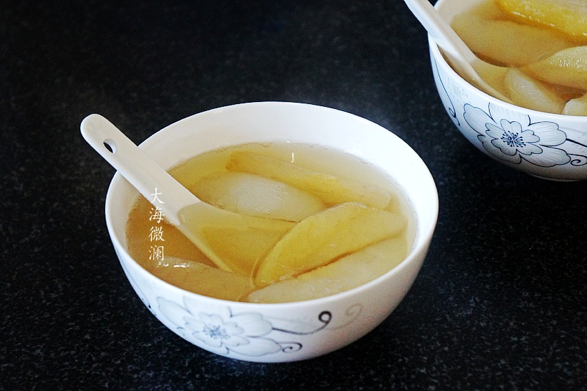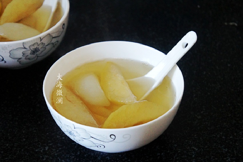 这汤就是冰糖雪梨汤,此汤清甜滋润不油腻,适合这个干燥的季节饮用,可以达到润泽肌肤、止咳化痰和润肺的效果。两三个雪梨加上冰糖煮一锅,做法也是超级简单,雪梨去皮切块,加上冰糖和适量的水,大火烧开,小火慢炖至梨块软软的就好,口感像罐头,特别好吃,没有任何添加剂,比罐头更健康。而且这两种食材对清肺大有好处,梨子口味丰富,富含果汁、甜味和酸味,营养丰富,含有多种维生素、纤维素和膳食纤维。具有润肺清燥、止咳化痰、养血生肌的作用。中老年人应该多吃梨,还可以帮助身体净化器官,储存钙,软化血管。