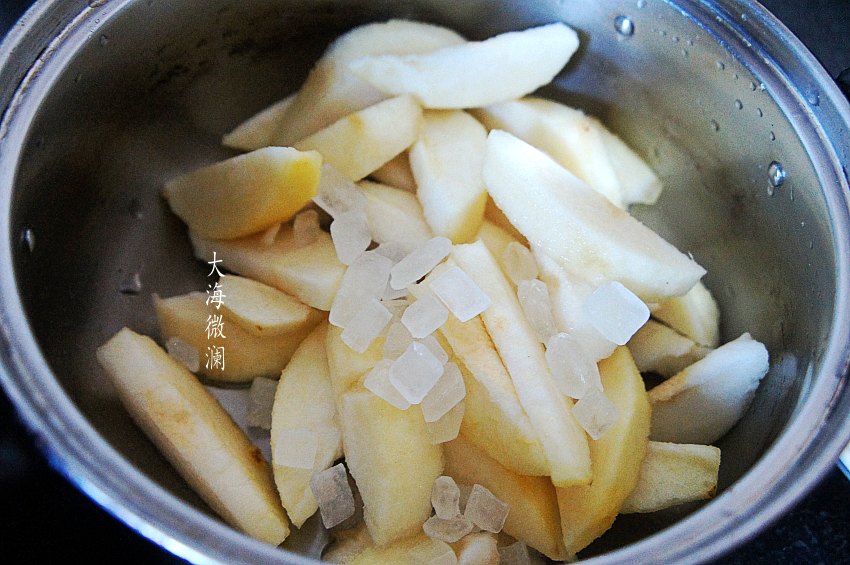放入汤锅中,加入适量的冰糖,冰糖的用量随个人喜好的口感增减。