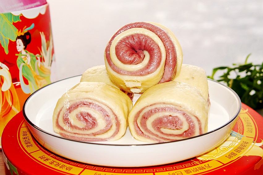 【双色还卷】所需食材:面粉400g;紫薯泥数量;糖适量;酵母4g。