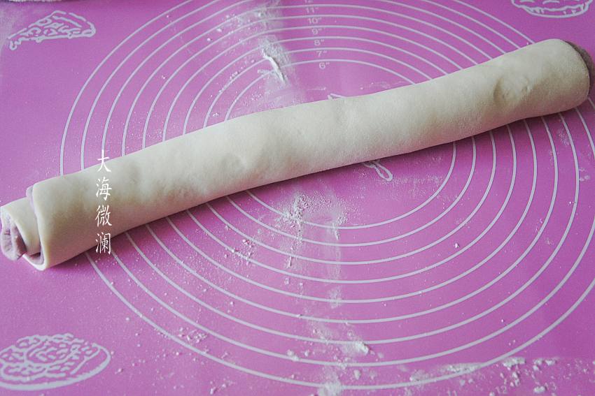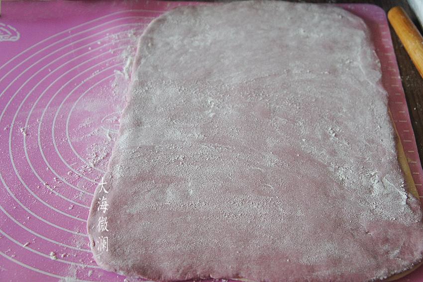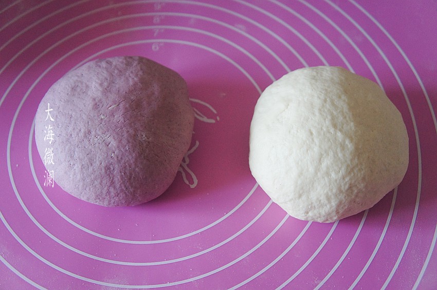 先将面粉一分为二,本色面团:温水化开2g酵母,加入到面粉中,根据自己喜欢的甜度加入适量的糖,拌到无干粉,揉成面团。紫薯蒸熟,压成紫薯泥,加入面粉中,再加入适量的温水溶解2g酵母,加入适量的糖,揉成面团。分别放入盆中,盖上保鲜膜自然发酵。