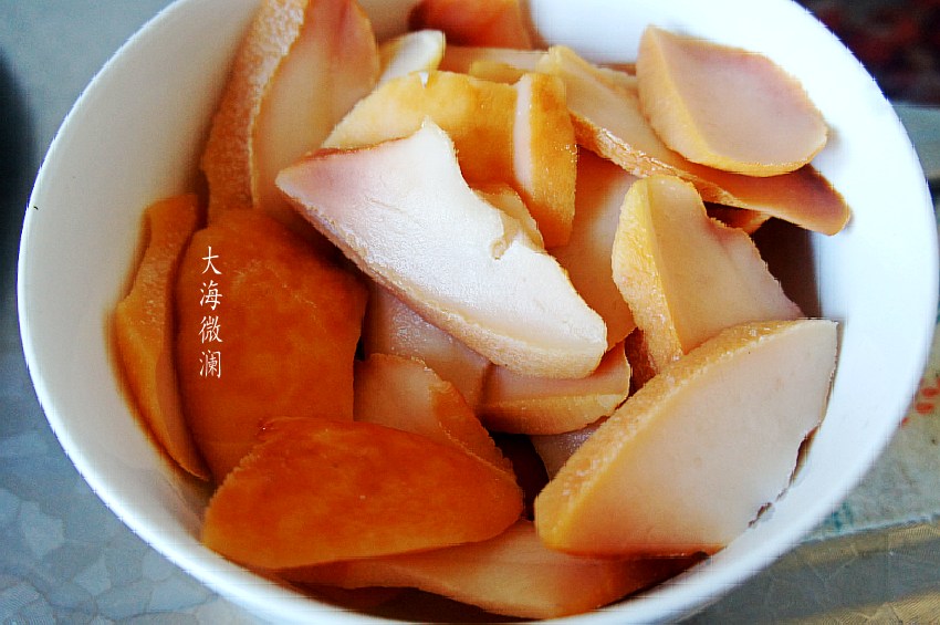 螺肉自然解冻后,去掉外壳,反复清洗干净,根据个人的喜好切片。