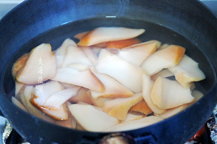 1、螺肉焯水,通常大约5到10分钟,看螺片的厚薄而定,一定要焯熟焯透,口感才脆嫩滑爽。