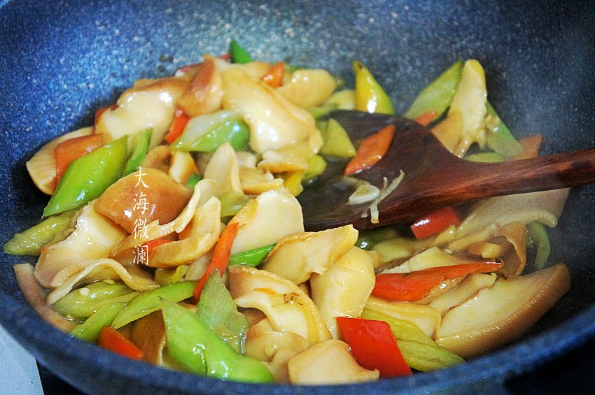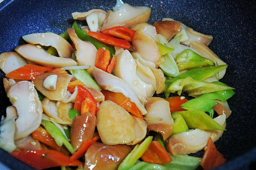 炒锅加入适量的油,爆香花椒粒捞出扔掉,爆香蒜、姜丝,然后下入螺片、青、红辣椒片大火爆炒。