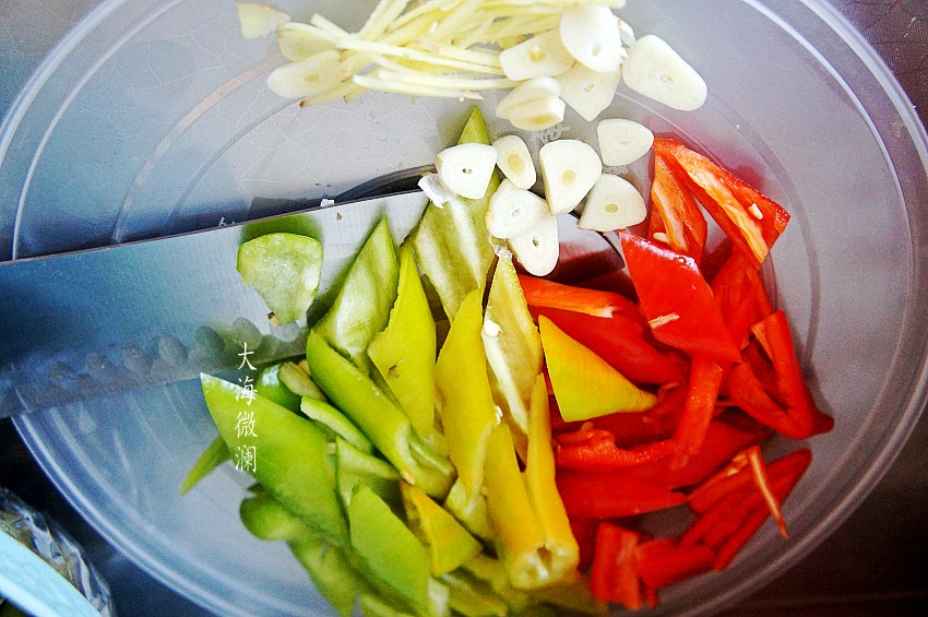 姜、蒜去皮洗净,切碎备用。青、红辣椒在淡盐水中浸泡十分钟,反复清洗干净,切菱形块。