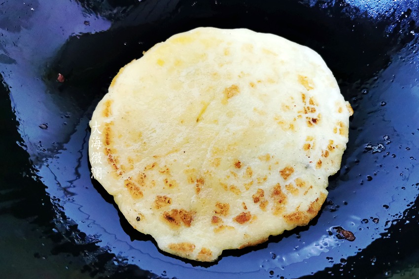 再翻面用勺子敲打至饼子舒展得更薄更大更粘糯,熟得也快,全程小火烙。