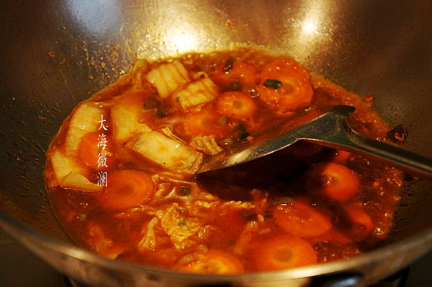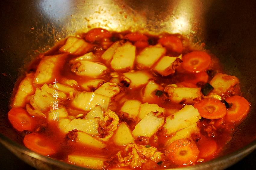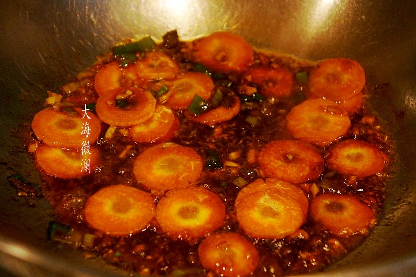 加入香辣汁、入胡萝卜片翻炒,炒至胡萝卜变软。