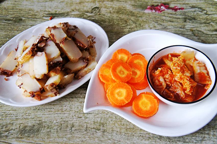 年糕晾凉后切片,胡萝卜去皮洗净切片,自家腌制的辣白菜切小块。