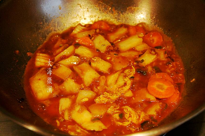 大火收汁,加点蘑菇粉调味,还可以根据个人喜好再加调料,感觉不够辣的可以加点辣椒粉,随个人喜欢的口味调整吧。我没加,辣白菜和香辣汁的辣度刚刚好,家里人都能接受。