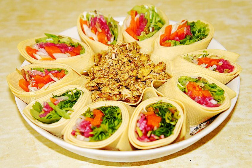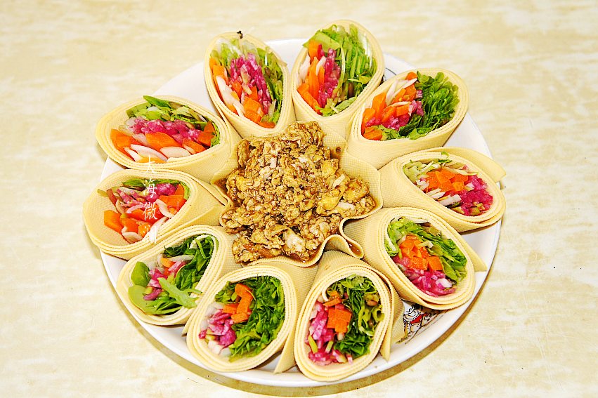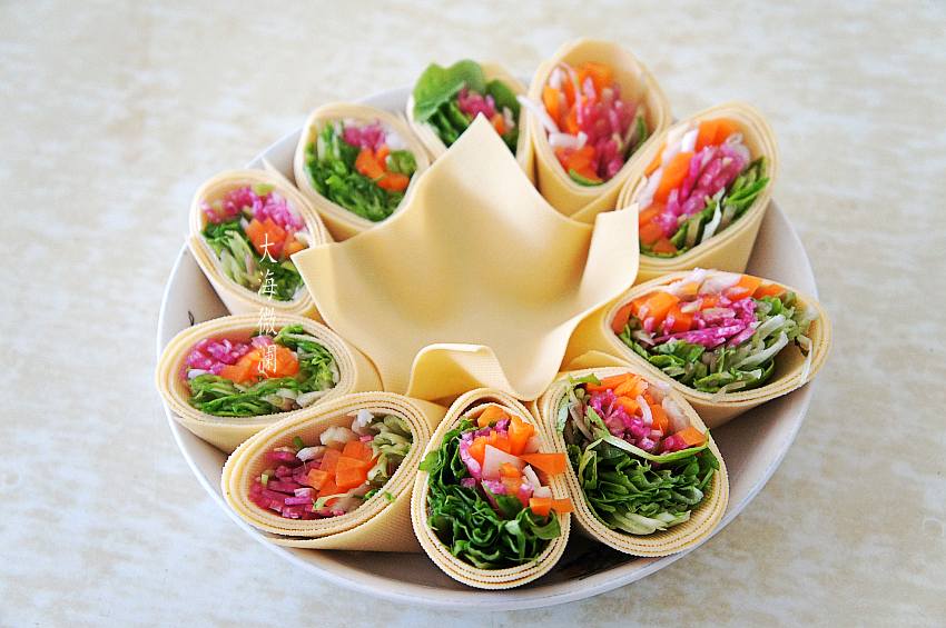 作为大豆制品,东北的干豆腐不同于南方出产的豆腐皮、千张儿,也不同于腐竹和豆腐干,东北干豆腐比千张更薄,生吃熟吃均可,特别有豆香味,尤其卷蘸酱菜备受青睐,很多餐厅都有这道蘸酱菜。相信来东北旅游的朋友一定都吃过这道菜,干豆腐中含有丰富的蛋白质,人体必需的8种氨基酸及多种矿物质,能增强免疫力,补充钙质,促进骨骼发育,对老人孩子的骨骼生长极为有利,补钙效果极佳。其实东北的干豆作为蘸酱菜,不一定都要卷起来,直接洗一盘蘸酱菜,炸一碗鸡蛋酱,干豆腐切成方块,吃的时候自己动手喜欢吃什么菜就卷什么菜,这就是地道的东北特色蘸酱菜,大海今天把干豆腐卷起来,不但好看,吃起来方便,色彩斑斓的看着更加有食欲。