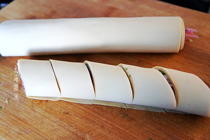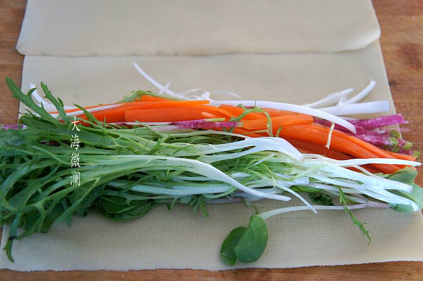 干豆腐2张,取一张干豆腐,铺开码入黄瓜丝、胡萝卜丝、各种小青菜、红心萝卜丝、大葱丝,从一头卷起来,注意要卷紧实一些。