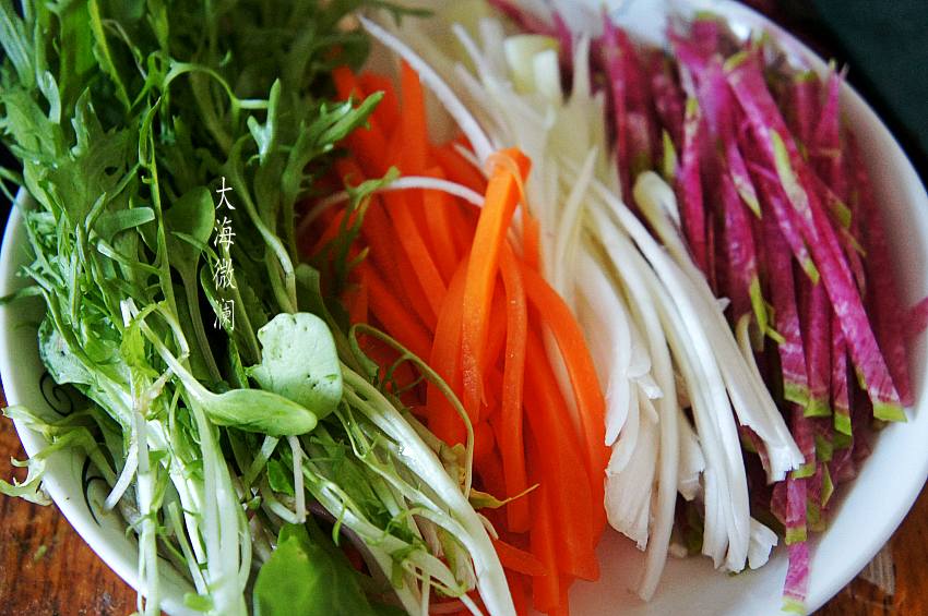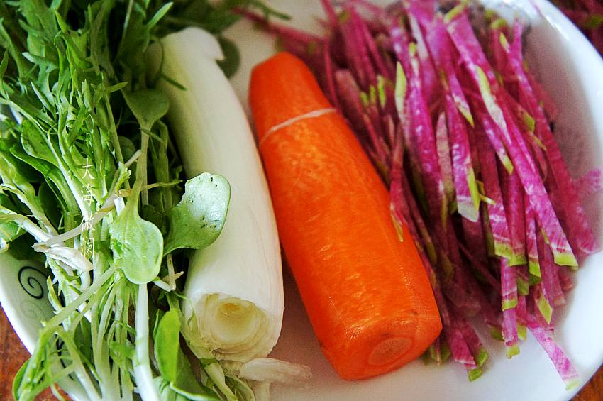 萝卜苗、苦菊、生菜等小菜洗净,在淡盐水中浸泡10分钟以上,再反复清洗干净,目的是去除农药残留。红心萝卜去皮洗净切丝,胡萝卜去皮洗净,大葱去皮洗净备用。