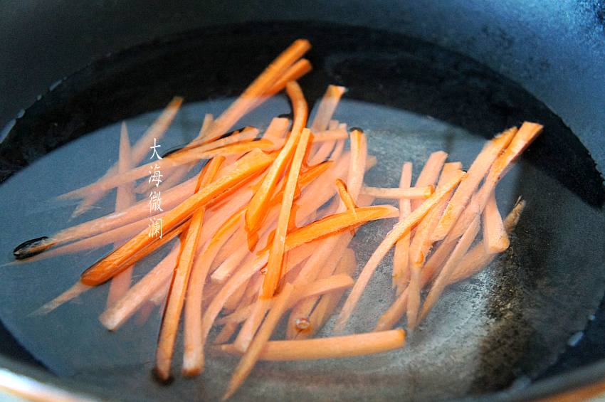 胡萝卜切丝,锅中加入适量的水,水开下入胡萝卜丝焯水,胡萝卜丝变软捞出,过冷水控净水分备用。