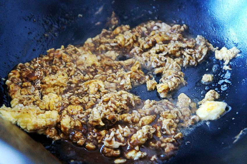 炸鸡蛋酱:鸡蛋打散,少许兑点水搅拌均匀,炒锅加入适量的油,倒入蛋液搅碎煎熟,鸡蛋尽量碎一点点,然后加入适量的自制大酱炸熟,OK!可以出锅了。