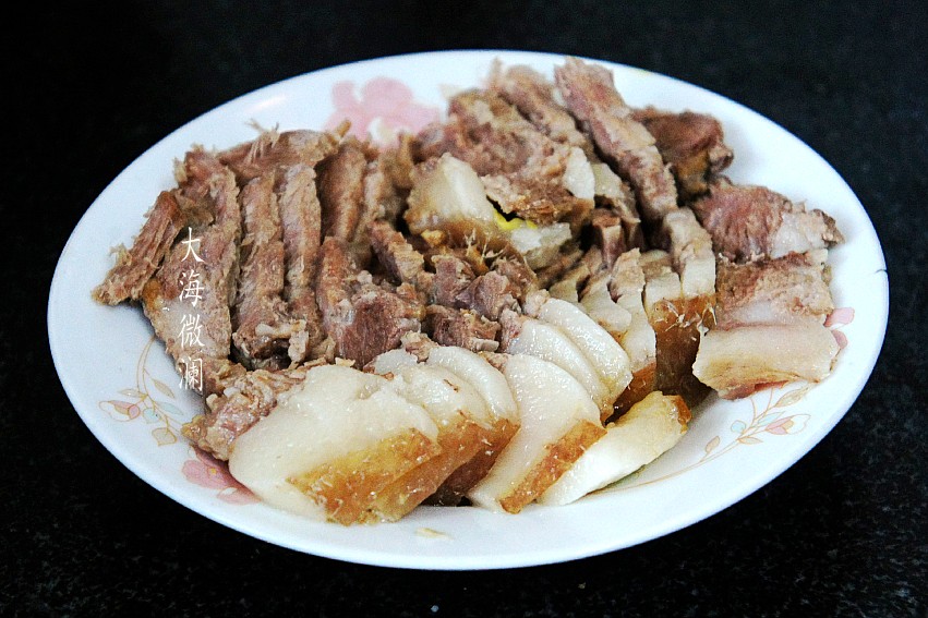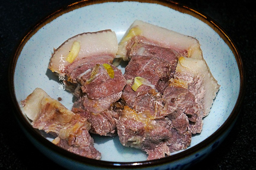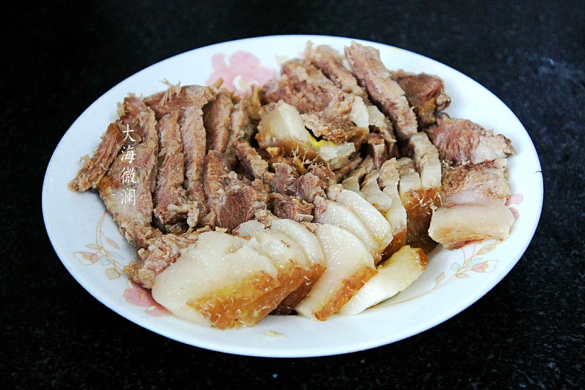 出锅,稍凉切片上桌,凉透了猪肉就发腻了,趁热吃,软软的肉片颤颤巍巍,入口即化,蘸蒜泥吃那叫一个香,而且香而不腻,吃上几片大肥肉真解馋,特别过瘾。
