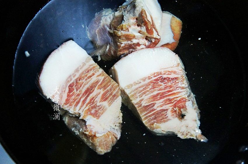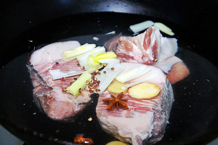 蒜泥白肉必须是带皮的肉,这是一块靠近猪血脖的肉,据说这个位置的肉最香了,被称为活肉,是猪经常运动的部位,冷水浸泡除血水摘除肉中杂质后洗净。