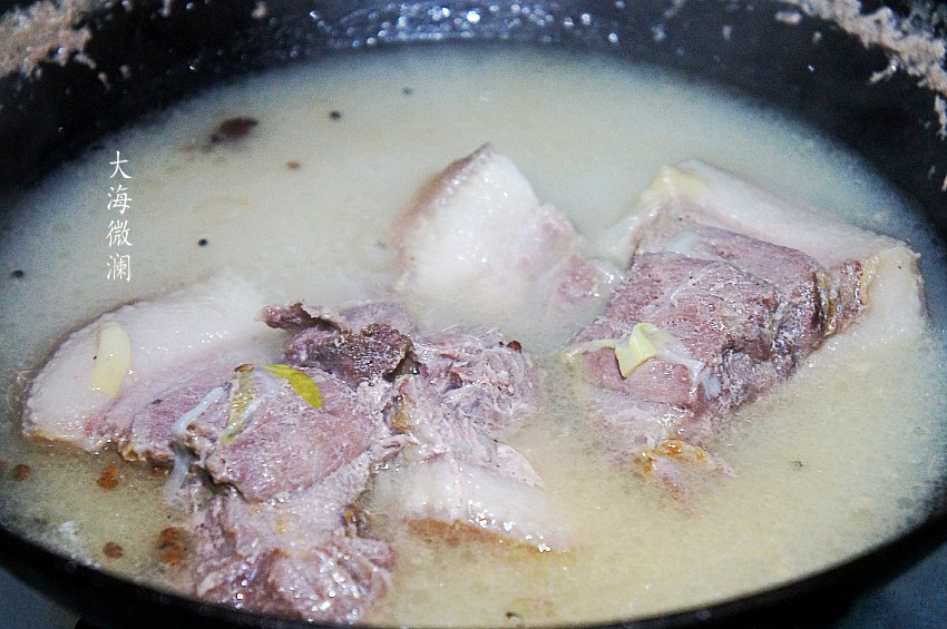 猪肉烀熟,用筷子扎一下瘦肉部分,一扎就透说明已经烀熟,不要烀过了,切不成片就不好吃了,这锅汤留着炖酸菜非常美味。正宗杀猪菜是猪身上各部位烀得差不多的时候,直接将切好的酸菜丢进锅里,和肉一起煮,酸菜特别香,而且端上桌还解腻。