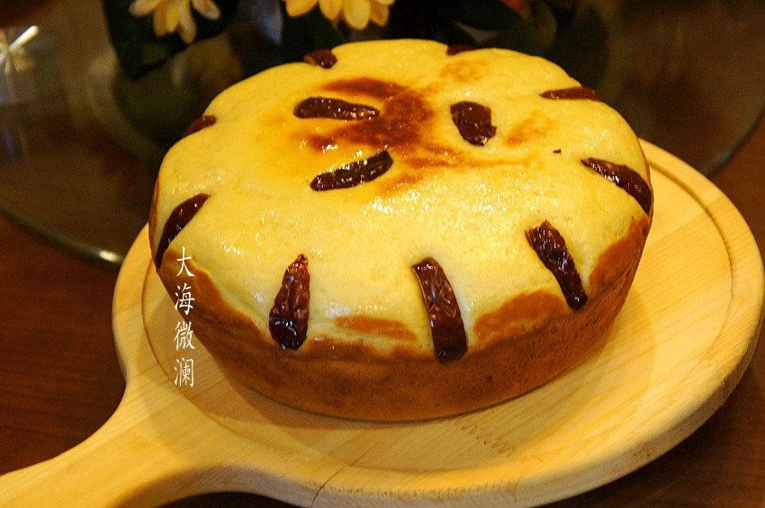 时间到,出锅,实际上不翻面烘烤也可以,因为发糕发酵的很高,而且表面不平,也只烤到中间一点点。
