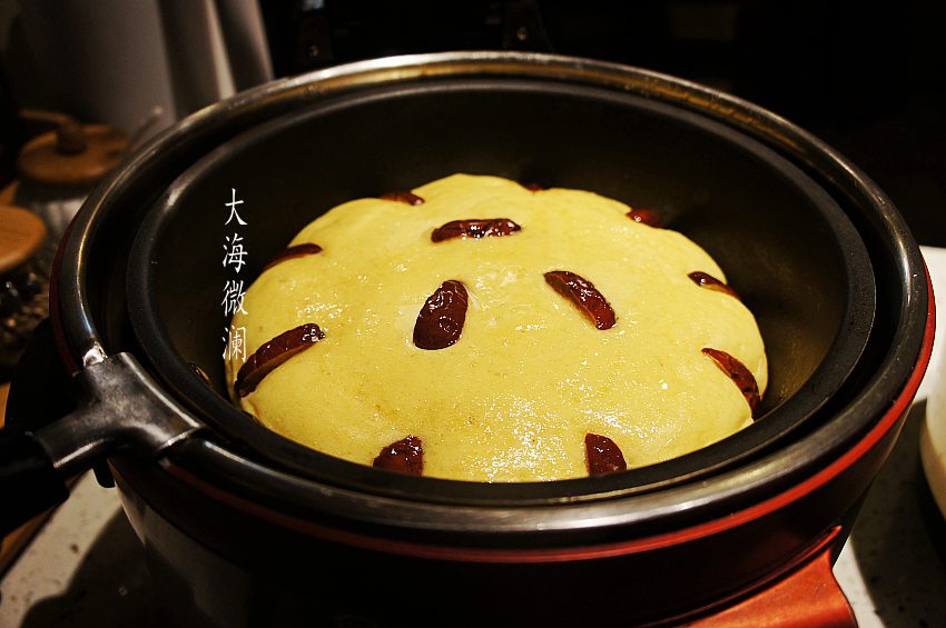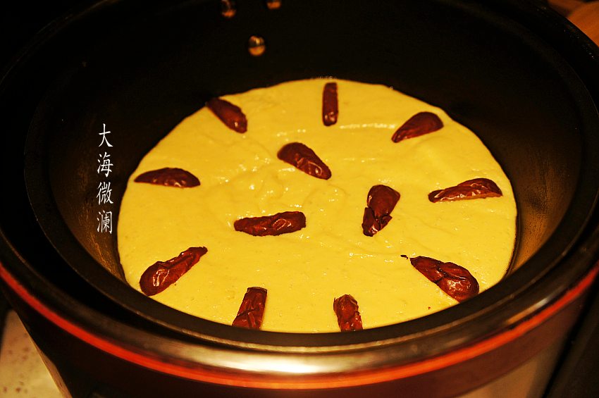 大枣洗净,去掉枣核,切大片,打开锅盖,在发酵好的面糊上摆上大枣,喜欢的可以多放点。