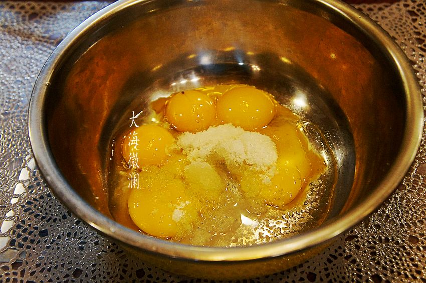 5个鸡蛋打散,加入适量的白糖,喜欢甜味的就多加点,糖尿病人就不要加糖了,再加入3g酵母,搅拌均匀。