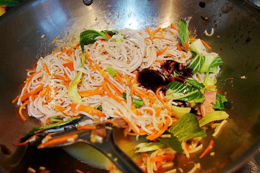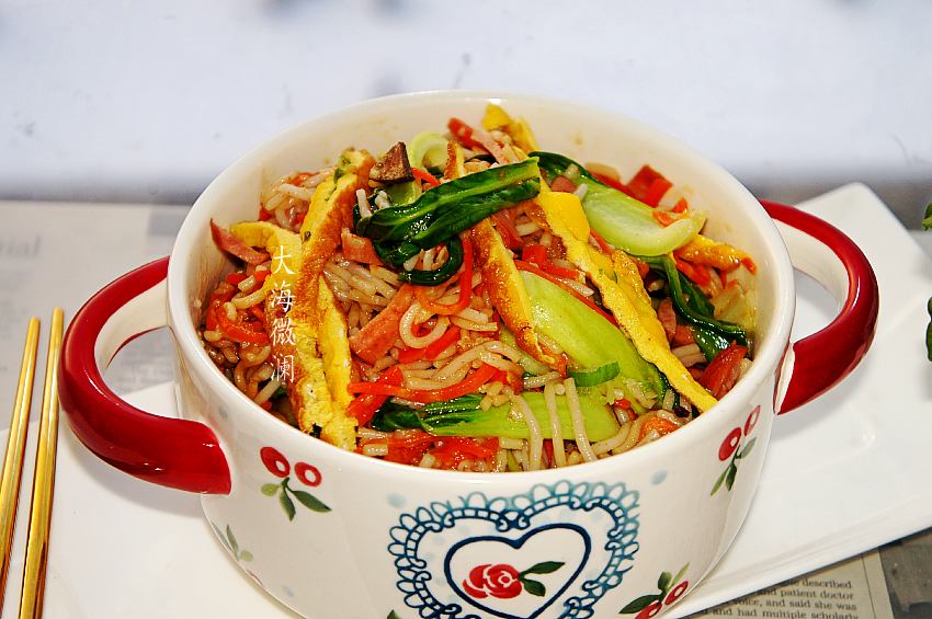 饭菜一锅出的方法非常适合上班族和懒人,无论是米饭还是炒面,都非常简单方便,不用花大把时间来炖菜或者炒菜,也不用承受煎炒烹炸的各种烟熏火燎,只要把需要的食材准备处理好,如果是煲仔饭放进锅里加上米饭和水,就可以等着享用啦,炒面也不过三五分钟就出锅,想吃什么做什么,味道超好而且营养一点也不打折。今天做的炒米线食材还比较丰富,刚好家里有网购的米线,清理冰箱赶紧消耗掉。炒米线也简单,一煮一泡再一炒就OK了。比挂面好吃,比手擀面滑嫩,老人孩子都爱吃。米线含有丰富的碳水化合物、维生素、矿物质及酵素等,具有熟透迅速、均匀,耐煮不烂,爽口滑嫩,易于消化的特点,特别适合快餐食用。铁的含量也高,吸收好,能促进造血功能,而且补充血清钙,常吃补血益气,聪耳明目。