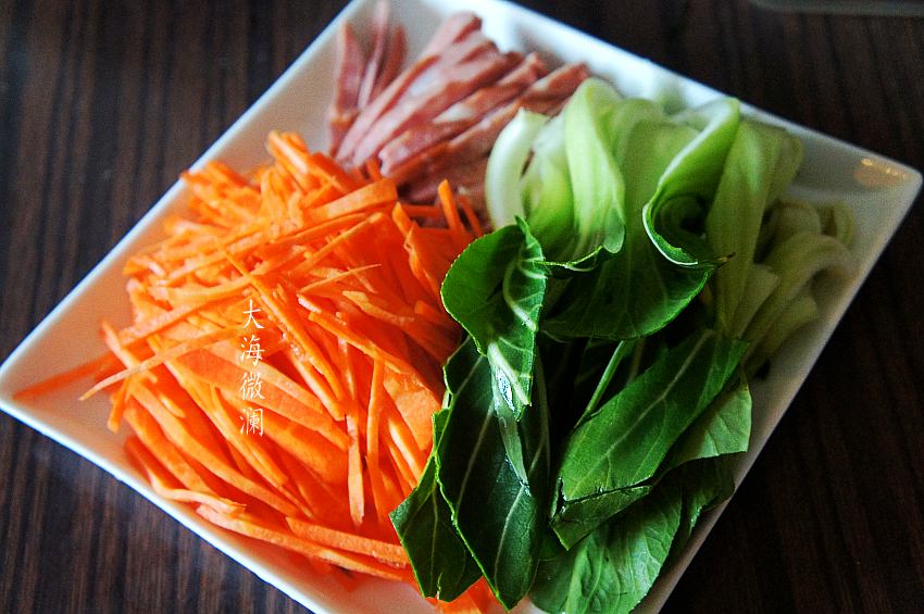 油菜在淡盐水中浸泡10分钟左右,然后反复清洗干净。胡萝卜去皮洗净,切丝;红肠洗净切条,哈尔滨红肠有肥肉有瘦肉,特别香,无论是炒饭还是炒面都喜欢放上点,还有一股淡淡的烟熏味道,很特别。