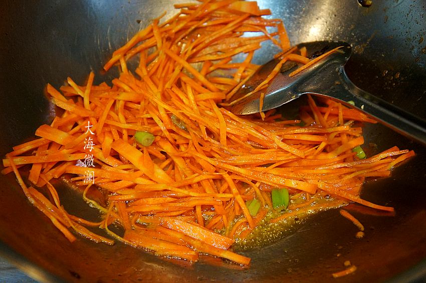炒锅加入适量的油,爆香五香粉和葱花,下入胡萝卜丝翻炒,炒至胡萝卜丝变软。胡萝卜熟食营养更丰富,用油炒熟后吃,在人体内可转化为维生素A,提高机体免疫力。