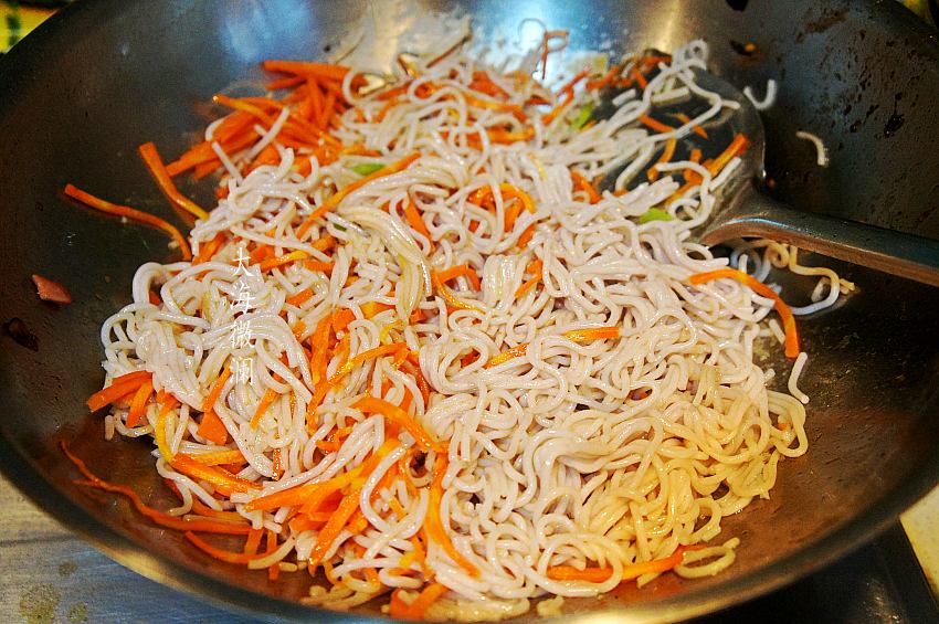 下入米线,注意轻轻翻动,然后将所有的蔬菜和红肠都加入锅中,轻轻翻炒。