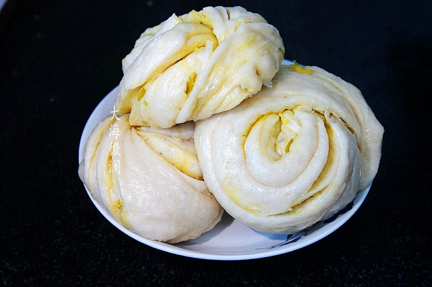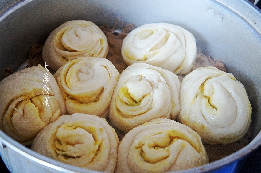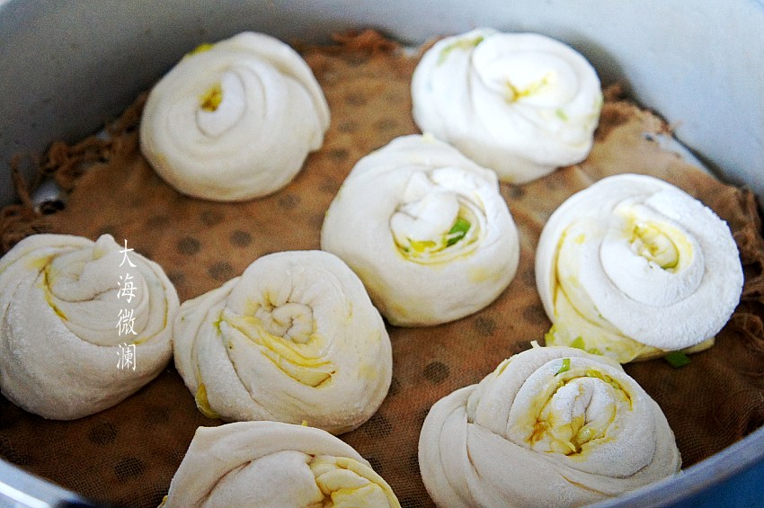 时间到,打开锅盖,满屋子葱香味,看看这大花卷,因为是用牛奶和面,颜色特别白,出锅就忍不住吃掉1个。