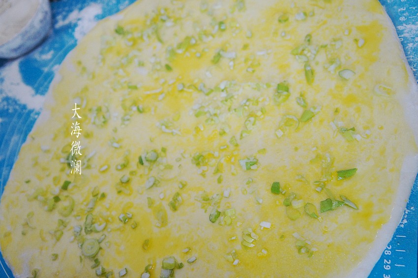 大葱去皮洗净切碎,将面团擀成大大的圆饼,刷上一层植物油,最好是豆油,蒸出来的花卷颜色漂亮,没有豆油色拉油也一样,然后撒上少许盐,再撒上一层切碎的葱花。