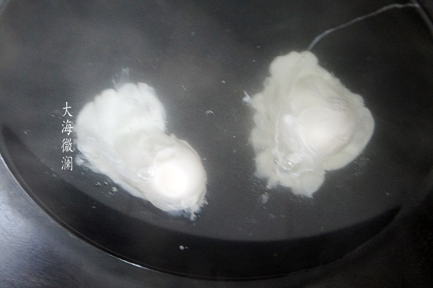 锅中加入适量的水,大火烧开,水翻开后关火,此时打入鸡蛋,盖上锅盖,让鸡蛋在开水中慢慢凝固成形,大约1~2分钟。最好是新鲜鸡蛋,陈旧鸡蛋容易飞沫。可以看到打入第二个鸡蛋时,第一个已经凝固的差不多了。