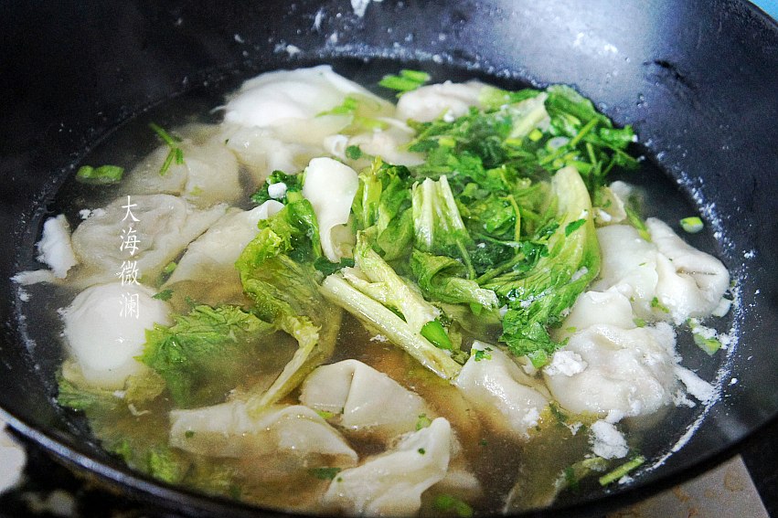 云吞煮好后关火,下入生菜叶,撒点葱花,撒点香菜末,加入盐、蘑菇粉、醋、少许生抽调味。喜欢的还可以加点香油或者茶油之类的调味,我什么油都没加,喜欢汤清味鲜,好吃不腻。