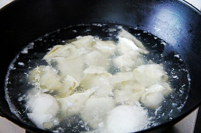 再次开火,轻轻滑动鸡蛋,漂浮起来,不用等水开,下入冷冻云吞,注意用勺子的背面去慢慢地推起沉在锅底的速冻馄饨,别沉底粘破了,像煮饺子一样,转中火煮开,加点冷水,再次煮开,再浇点冷水,第三次煮开,云吞就煮好了。