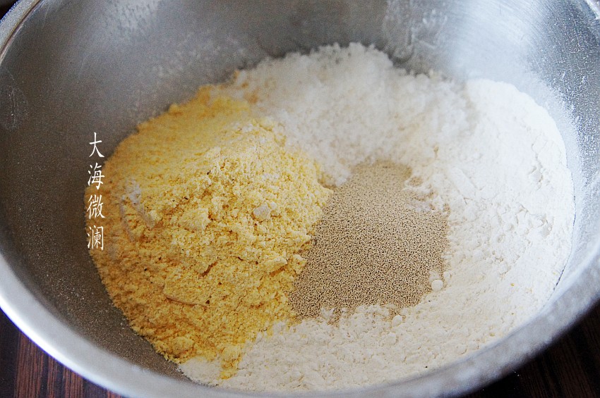 面粉2份,玉米面1份,加入适量的白糖,喜欢甜味的就多加点糖,糖尿病人就不要加糖了,再加入3g酵母,拌匀。