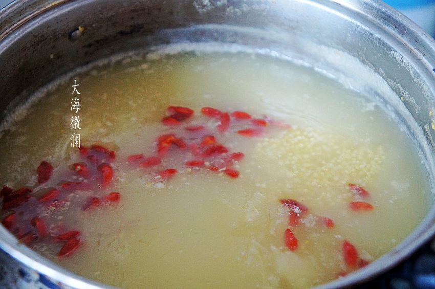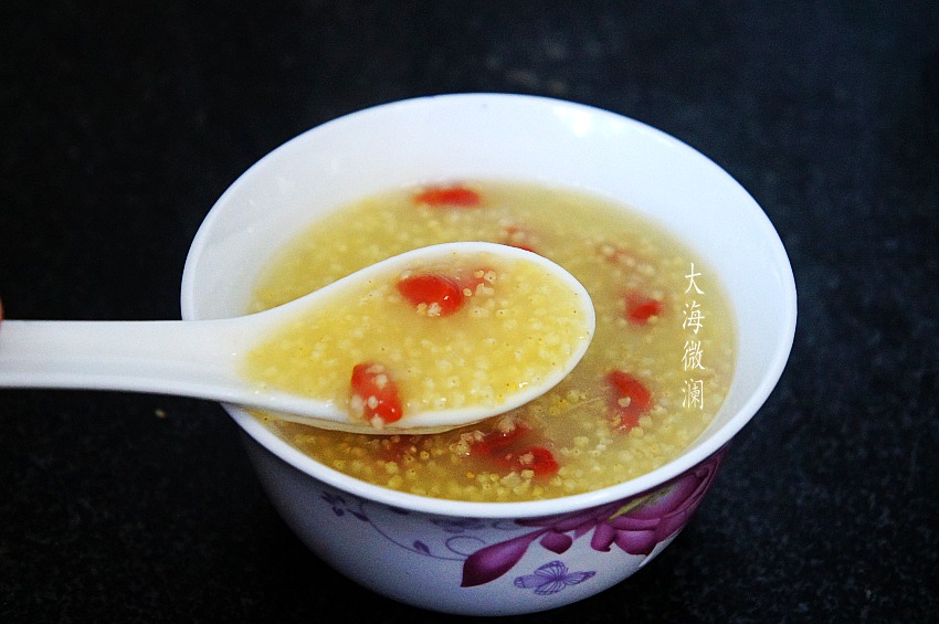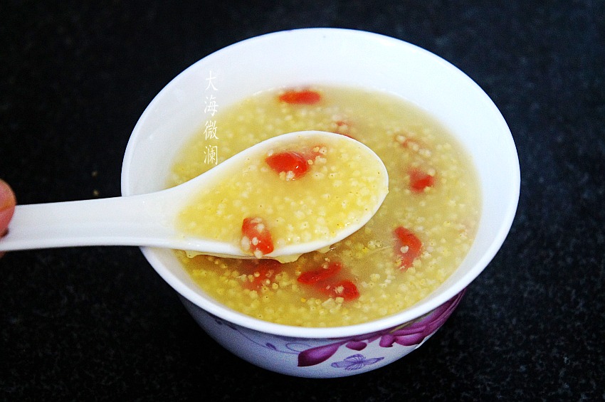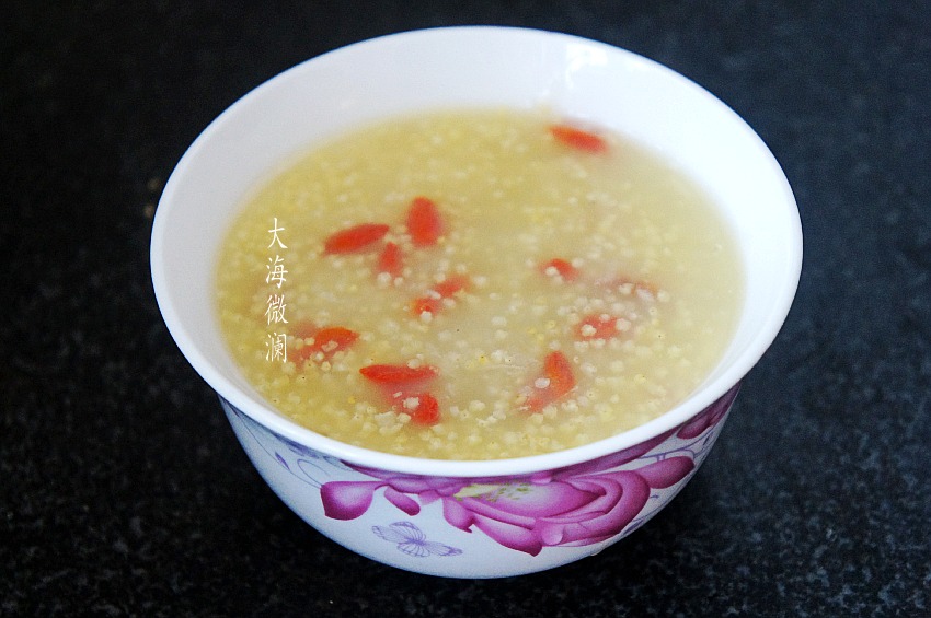 【枸杞小米粥】所需食材:小米1大勺;枸杞子适量。