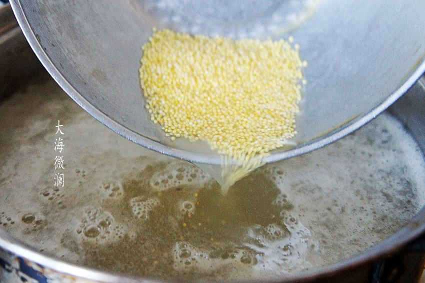 小米反复淘洗干净,汤锅加入适量的水,要多加一点,中途不能加水,水烧开后下入淘洗干净的小米,用勺子搅拌均匀大火烧开,转小火。