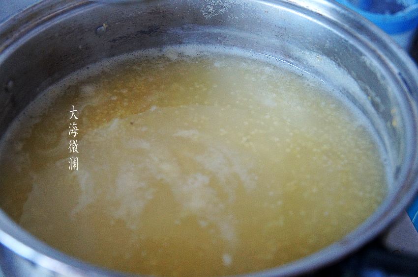 小火煮上20分钟左右,如果你有时间可以盖上锅盖注意观察,否则不用盖锅盖,因为小米特别容易瀑锅,一不留神就瀑锅,所以我从来都不盖锅盖,小火慢慢的煮,开水下锅小火煮,小米不糊底不粘锅,越煮越粘稠。